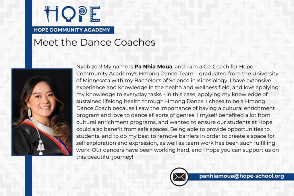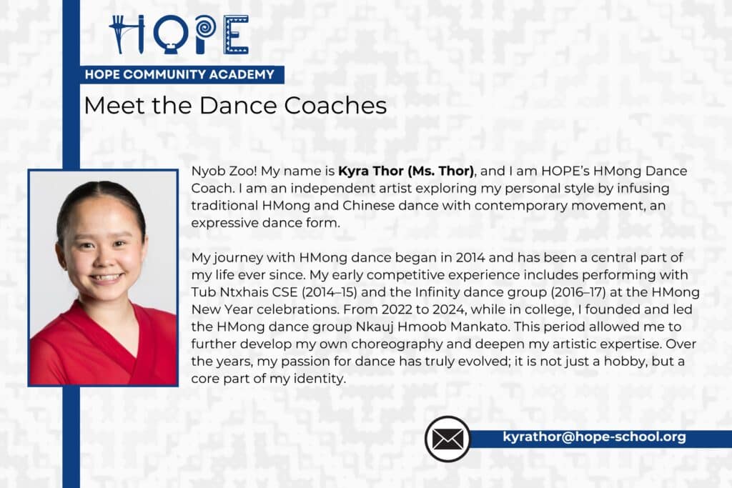 “Our vision for HOPE’s HMong Dance Team is to honor HMong history and identity through an inclusive dance program that fosters cultural preservation, teamwork, and professional performance skills. By focusing on values like community, perseverance, and respect, we aim to develop confident dancers who master both technical HMong dance styles and essential life skills—such as leadership, creativity, and collaboration—through a shared, expressive learning experience.” – Kyra Thor